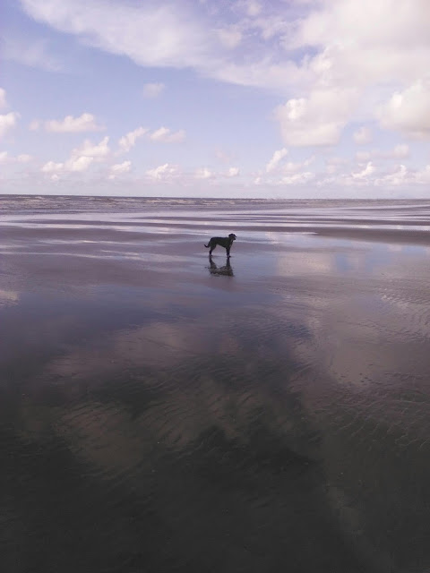 Kitty and I took the rattly bus to Ynyslas this afternoon for an hour on the beach; she was very good, though it is quite noidy and stressful. The rain during the trip over cleared suddenly and it was lovely for our low-tide walk. A magical place, truly.